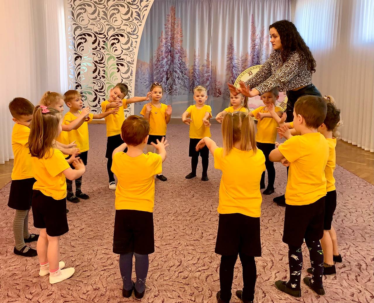 Цікавою формою роботи є інсценізації під музику, де малюки за допомогою власного тіла відтворюють образи природи – політ пташки, хитання дерев від вітру, схід і захід сонця тощо. Це дозволить дітям відчути себе у гармонії з природою. Також, для розвитку пам’яті, уваги та уяви можна розіграти музичну казку. Наприклад, «Вовк та семеро козенят», де козенята можуть виконувати танок-імпровізацію, грати з мамою Козою у музично-ритмічну гру, а Вовк, імітуючи високі та низькі звуки, використовувати музичні інструменти (низький голос – барабан, високий – дзвіночок).