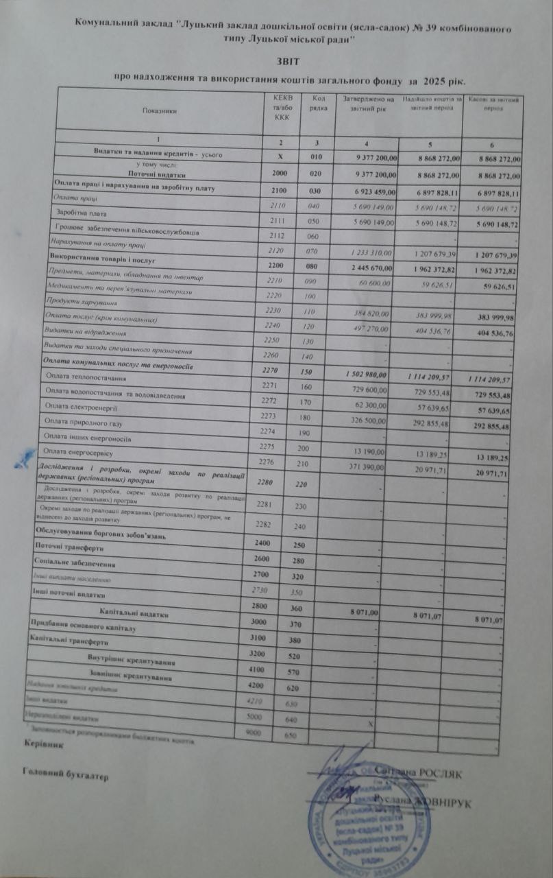 Звіт про надходження та використання коштів загальнного фонду за 2025 рік